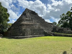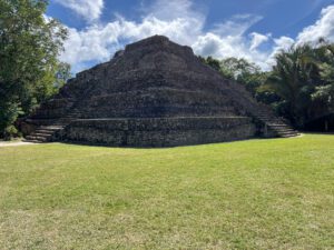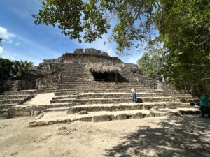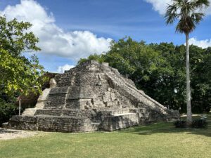 The next ruins we drove to were called Chacchoben, “The Place of Red Corn” Here, in this lush tropical setting, the excavated sacred temples and other structures gave us a sense of wonder picturing how it must have looked centuries ago when it was a thriving cultural center for the Mayans. We saw the original red paint on the stucco walls of one of the pyramids and the temple where a mural was found showing the astronomical positions of the planet Venus. We also had a chance to climb the Gran Basamento which took us above tree level and is where archaeologists found ceremonial offerings dating to around 1000 B.C.